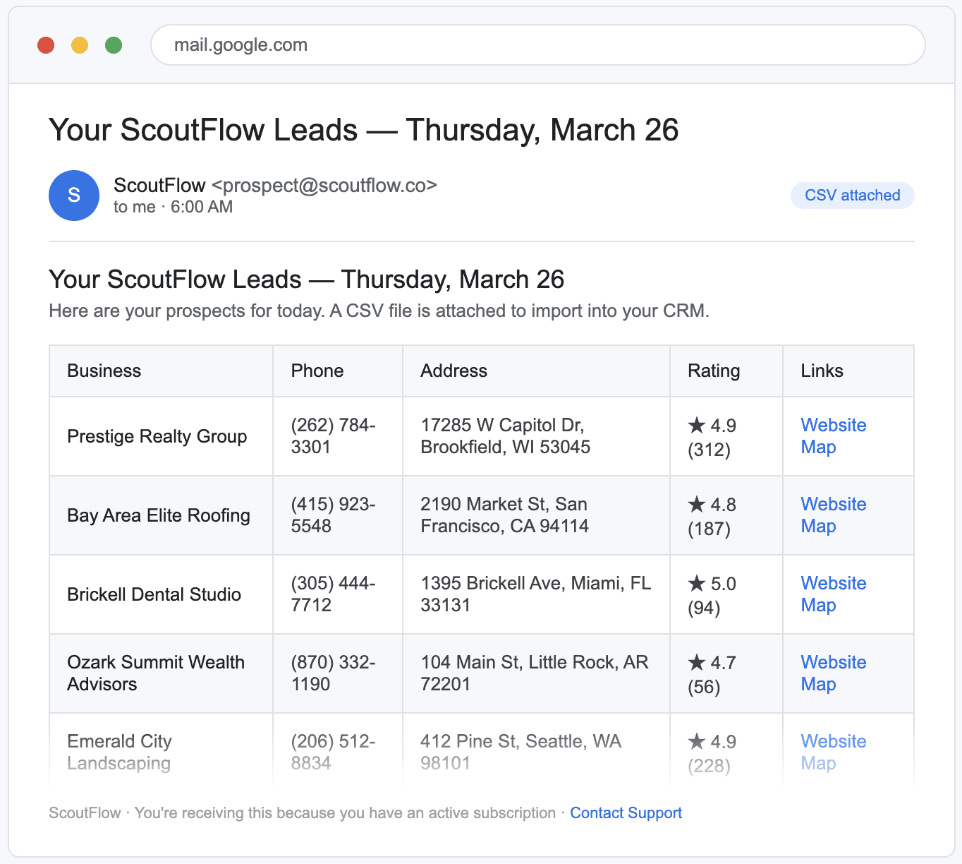 Every morning ScoutFlow delivers a fresh batch of local businesses straight to your inbox. Real estate agents, restaurants, HVAC companies, dental offices, fitness studios and dozens more — all in your zip code, all with contact info ready to go. Just open your email and start dialing.